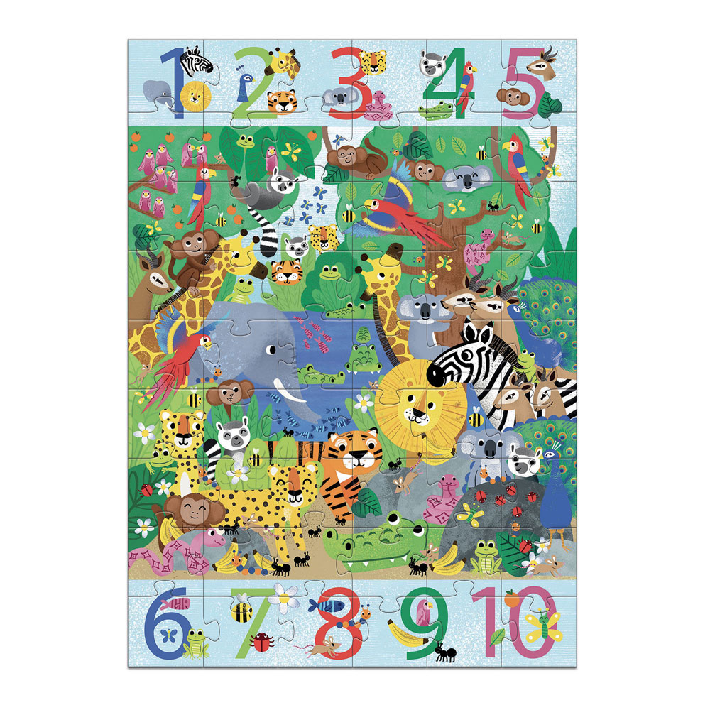 Eκπαιδευτικό παζλ γίγας από την εταιρεία Djeco, που απεικονίζει μια πολύχρωμη ζούγκλα γεμάτη με χαριτωμένα ζώα. Αποτελείται από 54 μεγάλα ανθετικά και ασφαλή κομμάτια και απαιτεί χώρο κατά τη συναρμολόγηση, καθώς έχει μέγεθος 70 x 50 εκ. συνολικά. Στο επάνω και κάτω μέρος του υπάρχει σειρά με αριθμούς από 1 έως 10, που αποτελούν μικρές αριθμητικές προκλήσεις, στις οποίες καλείστε να ανακαλύψετε πόσες φορές εμφανίζονται τα ζωάκια μέσα στη ζούγκλα. Μία δημιουργική απασχόληση που συντελεί στην ανάπτυξη της αντίληψης, της οργάνωσης, της συγκέντρωσης και της παρατηρητικότητας του παιδιού, ενώ παράλληλα το εισάγει στον κόσμο των αριθμών. Αναπτύσσει τη λεπτή κινητικότητα. Διδάσκει υπομονή, αυτοπεποίθηση και αυτοέλεγχο και αποτελεί μία πρώτης τάξεως πνευματική άσκηση!