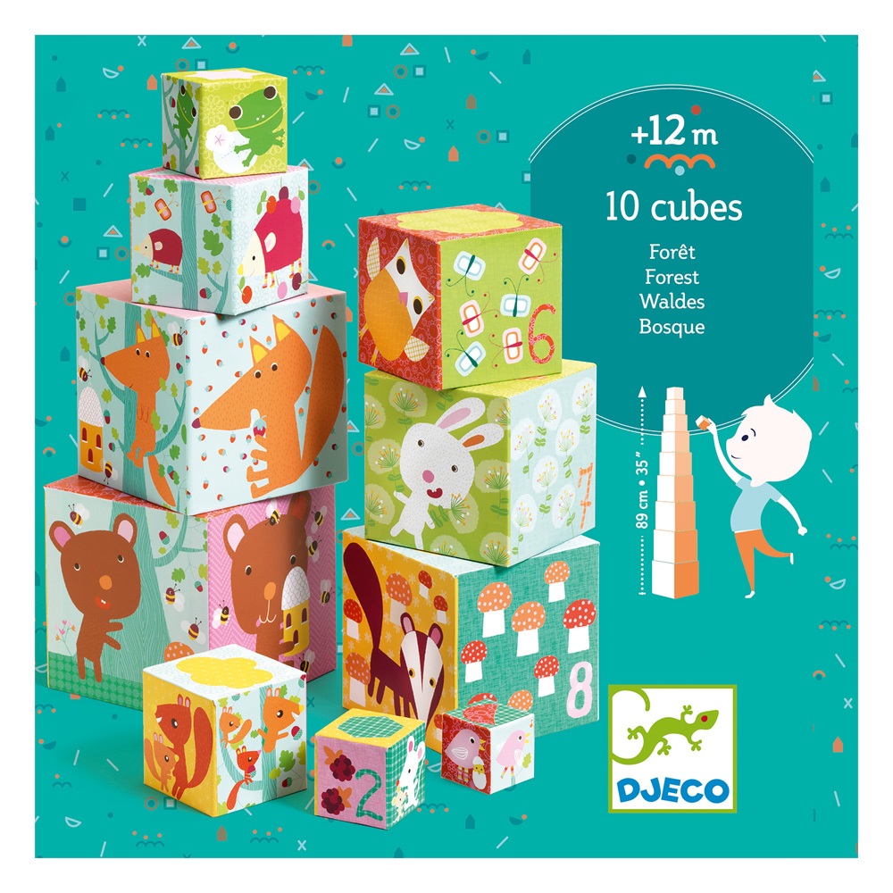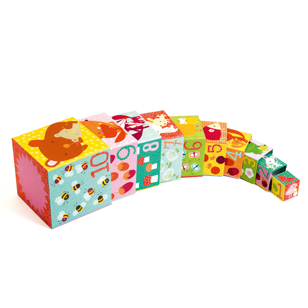 10 κύβοι στοίβαξης με αρίθμηση και πολύχρωμα σχέδια σε κάθε τους πλευρά, προσελκύουν το ενδιαφέρον των παιδιών για ατέλειωτο παιχνίδι. Τους συνθέτουν, τους ταξινομούν και σύμφωνα με τη φαντασία τους δημιουργούν διάφορες παραστάσεις. Ένα παιχνίδι της Γαλλικής εταιρίας Djeco που αναπτύσσει τον συντονισμό ματιού-χεριού και την λεπτή κίνηση.
