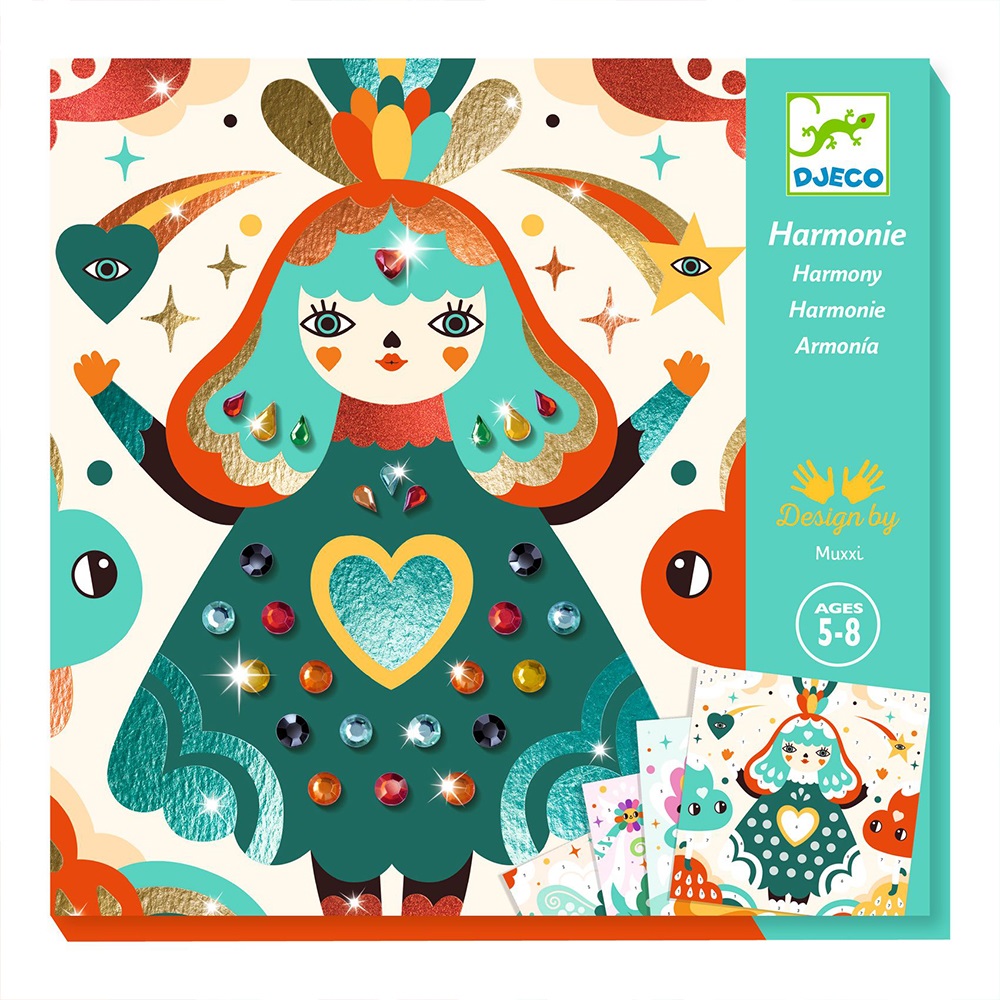 Χειροτεχνία με φύλλα χρυσού και πετράδια της εταιρίας Djeco. Τα παιδιά ξεκολλούν αυτοκόλλητα και τοποθετούν πάνω στη κόλλα τους χρωματιστά μεταλιζέ φύλλα. Στη συνέχεια, τοποθετούν αυτοκόλλητα πετράδια σε συγκεκριμένα σημεία για να δημιουργήσουν 4 κάρτες με παραμυθένια πλάσματα! Το μεταλλικό εφέ και τα τρισδιάστατα πετράδια προσδίδουν οδηγούν σε ένα εντυπωσιακό τελικό αποτέλεσμα που μπορεί αν γίνει ιδανική επιλογή για το στολισμό του παιδικού δωματίου. Μία ευχάριστη δραστηριότητα που συμβάλλει στη συγκέντρωση, τη παρατηρητικότητα και την ανάπτυξη της λεπτή κινητικότητας των παιδιών, ενώ παράλληλα καλλιεργεί την φαντασία, την επιμονή και την αυτοπεποίθηση τους. Το σετ περιλαμβάνει 4 παραμυθένιες κάρτες, 7 μεταλιζέ φύλλα σε διαφορετικά χρώματα, πάνω από 100 αυτοκόλλητα πετράδια και εικονογραφημένες οδηγίες.
