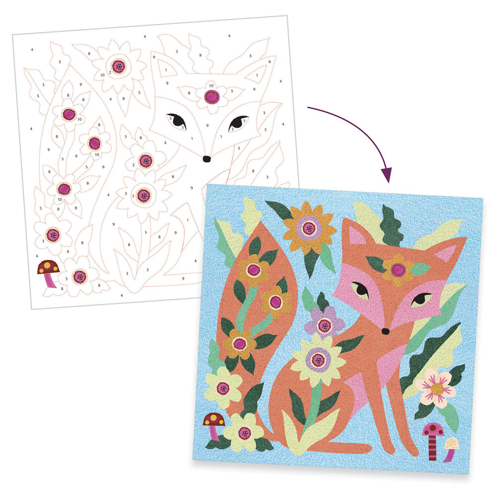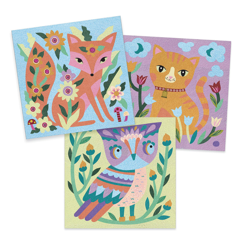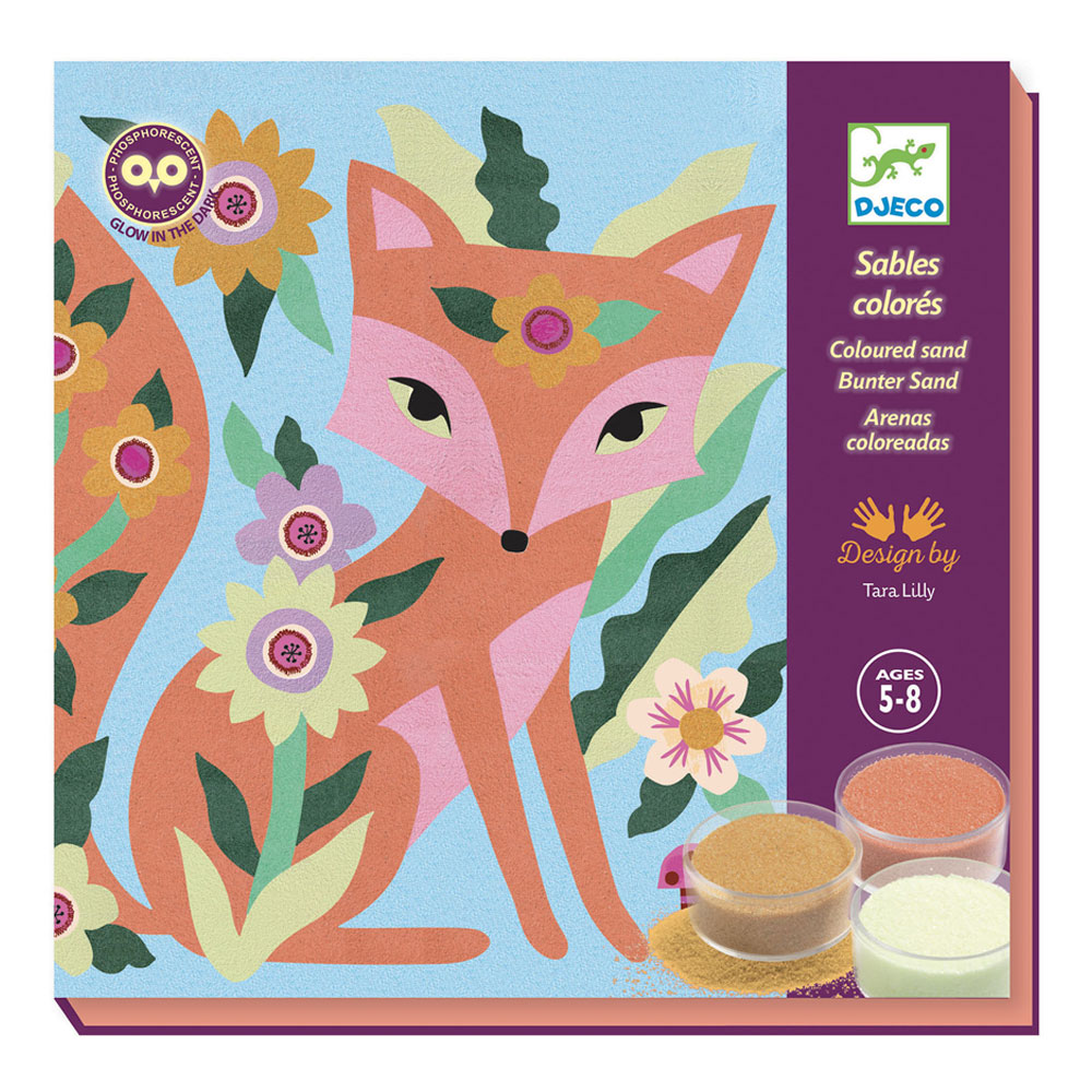 Χειροτεχνία από τη εταιρεία Djeco. Μία μοναδική εικαστική τεχνική με χρωματιστή άμμο. Αφαιρέστε το αυτοκόλλητο με το ειδικό εργαλείο και τοποθετήστε πάνω το αντίστοιχο χρώμα άμμου. Δείτε τα ζωάκια σας και στο σκοτάδι! Τα χρώματά τους αλλάζουν! Μπορείτε να αδειάστε την άμμο που θα περισσέψει στην ειδική τρυπούλα, που βρίσκεται στην άκρη του κουτιού και να αποθηκευτεί στο βαζάκι της. Περιέχει 6 βαζάκια με χρωματιστή άμμο, 6 βαζάκια με χρωματιστή άμμο που φωσφορίζει στο σκοτάδι, 4 προσχεδιασμένες κάρτες, 1 εξάρτημα για την αφαίρεση των αυτοκόλλητων και ένα εγχειρίδιο με αναλυτικές οδηγίες.