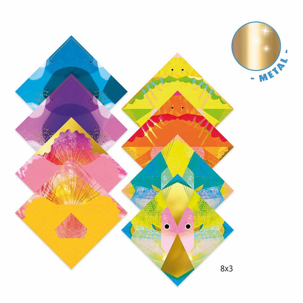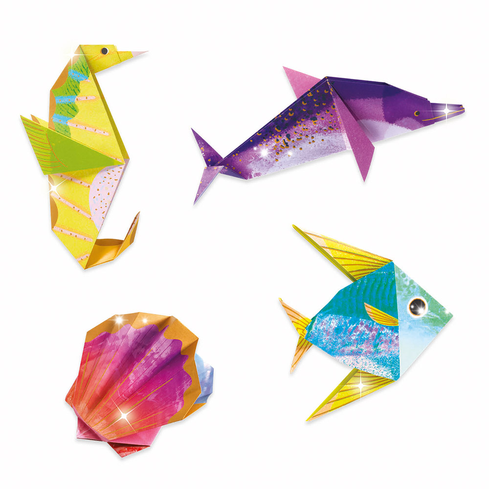 Αυτό το σετ κατασκευής οριγκάμι “ψαράκια” της Djeco είναι μια υπέροχη εισαγωγή στην τέχνη του διπλώματος χαρτιού. Ακολουθήστε τις οδηγίες για να ολοκληρώσετε 4 διαφορετικά θαλάσσια πλάσματα. Κάθε πακέτο περιέχει 24 φύλλα, διάστασης 20×20εκ. το κάθε ένα, με σχέδια και μεταλλικές λεπτομέρειες και μπορείτε να δημιουργήσετε 3 αντίτυπα σε κάθε σχέδιο.