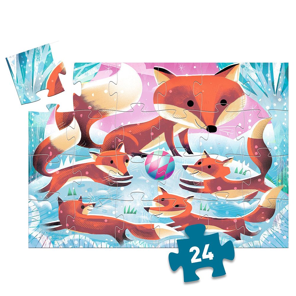 Παζλ 24 κομματιών της εταιρίας Djeco σε πρωτότυπο σχηματικό κουτί που ξεχωρίζει. Μελετήστε την εικόνα προσεχτικά και ενώστε τα κομμάτια του παζλ για να φτιάξετε μια χαρούμενη παρέα από αλεπουδάκια! Μια δημιουργική ενασχόληση που καλλιεργεί τη συγκέντρωση και την υπομονή των παιδιών και αναπτύσσει την παρατηρητικότητα και την λεπτή κινητικότητα τους.