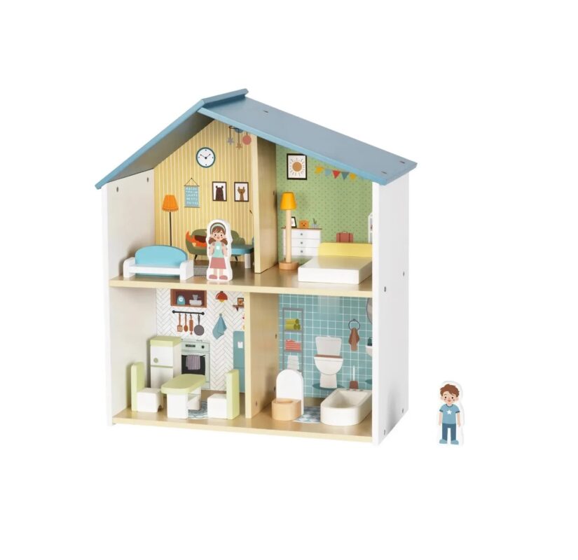 Δημιουργήστε έναν κόσμο ευφάνταστου παιχνιδιού με αυτό το ξύλινο κουκλόσπιτο με έπιπλα και φιγούρες. Με ένα ζεστό και άνετο εσωτερικό, το κουκλόσπιτο περιλαμβάνει ένα υπνοδωμάτιο, σαλόνι, κουζίνα και μπάνιο, όλα επιπλωμένα με όμορφα έπιπλα και διακοσμητικά αυτοκόλλητα. Τα παιδιά μπορούν να διακοσμήσουν και να διαμορφώσουν κάθε χώρο ελεύθερα, ενθαρρύνοντας την δημιουργικότητα, την ανάπτυξη της λεπτής κινητικότητας και το διαδραστικό παιχνίδι. Το σετ περιλαμβάνει και 2 ξύλινες φιγούρες, ιδανικές για παιχνίδι ρόλων. Κατασκευασμένο από οικολογικό ξύλο με λείες άκρες, αυτό το κουκλόσπιτο είναι ασφαλές, ανθεκτικό και ιδανικό για ατελείωτες περιπέτειες.