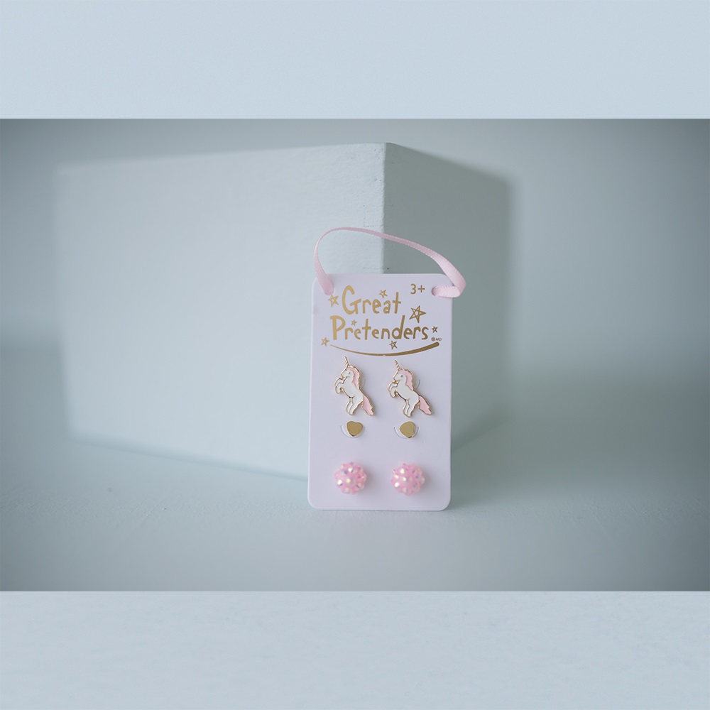 Υπέροχο σετ σκουλαρικιών με χαρούμενα σχέδια από την εταιρεία Great Pretenders. Τρία πανέμορφα σχέδια για μοναδικές εμφανίσεις που θα γίνουν τα αγαπημένα αξεσουάρ των παιδιών, προσδίδοντας μια ιδιαίτερη νότα σε κάθε εμφάνισή τους.