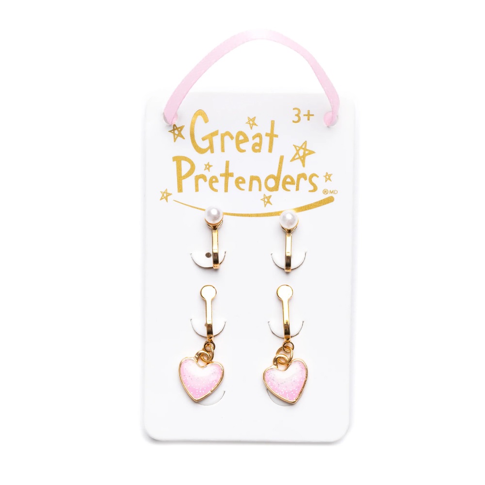 Υπέροχο σετ σκουλαρικιών με κλιπ από την εταιρεία Great Pretenders με πέρλα και καρδούλα. Δύο πανέμορφα σχέδια για μοναδικές εμφανίσεις! Το κάθε ζευγάρι διαθέτει κλιπ για την στερέωση στα αυτάκια των παιδιών. Εύκολα στην τοποθέτηση και στην αφαίρεση. Αυτά τα σκουλαρίκια θα γίνουν τα αγαπημένα τους αξεσουάρ, προσδίδοντας μια ιδιαίτερη νότα σε κάθε εμφάνισή τους.