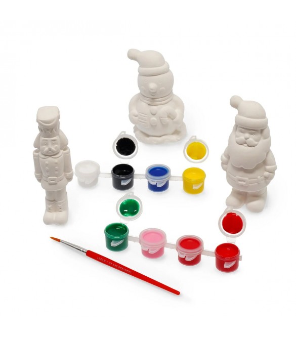 Περιλαμβάνει: 3 γύψινες φιγούρες: Καρυοθραύστης, Χιονάνθρωπος, Άγιος Βασίλης, 7 χρώματα τέμπερες, 1 πινέλο ζωγραφικής.