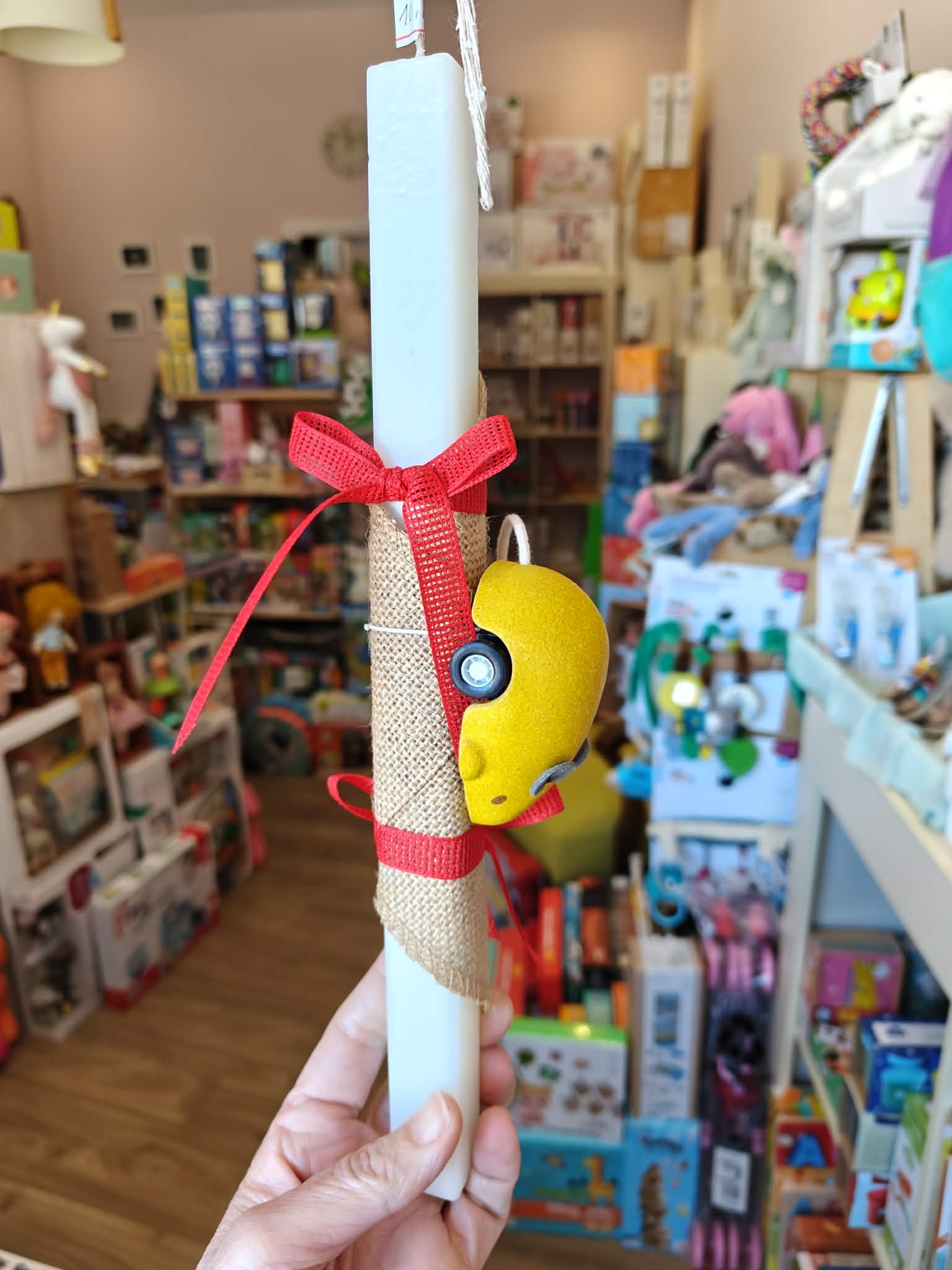 Λαμπάδα τετράγωνη σε εκρού χρώμα με άρωμα βανίλια στολισμένη με ξύλινο κίτρινο Ποντικάκι με μηχανισμό pull back της εταιρίας Plan Toys.