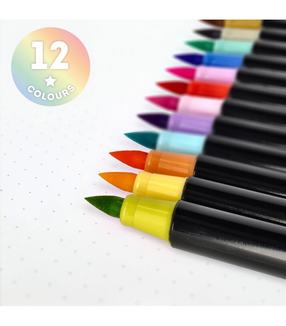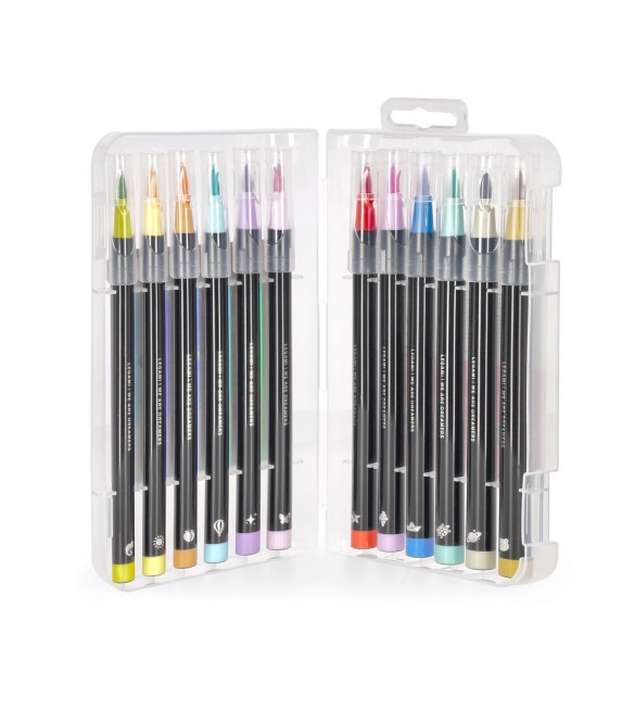 Τόσα πολλά στυλ, τόσο λίγος χώρος! Διευρύνετε τη φαντασία σας και εξερευνήστε τις δυνατότητες με το Σετ 12 μαρκαδόρων με πινέλο σε παστέλ τόνους από τη Legami. Αλλάξτε τη γωνία και την ποσότητα πίεσης που εφαρμόζετε για να πειραματιστείτε με διαφορετικά εφέ και στυλ και δημιουργήστε σχέδια ή γραμματοσειρές με ένα μεγάλο εφέ WOW!