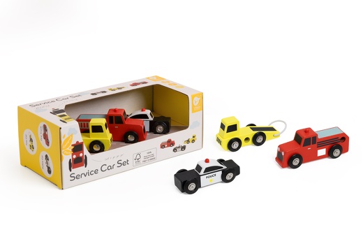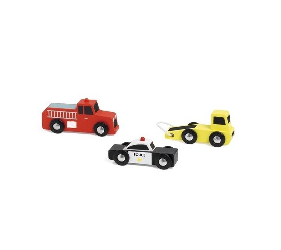 Αυτό το σετ περιλαμβάνει ένα ρυμουλκό, ένα περιπολικό και ένα πυροσβεστικό όχημα. Μπορούν, επίσης να κινηθούν και σε γραμμές τρένου. Τα παιδιά θα εξασκήσουν τις οδηγικές τους ικανότητες μαζί με τον συντονισμό χεριού-ματιού. Είναι κατασκευασμένα από πιστοποιημένο ξύλο (FSC).