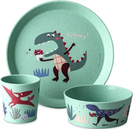 Το παιδικό σετ τραπεζαρίας Rex Dino από την Koziol περιλαμβάνει ένα ποτήρι, ένα μπολ και ένα πιάτο σε κίτρινα χρώματα και με εικόνες από αφρικανικά ζώα.