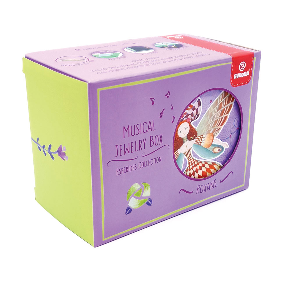 Μουσικό κουτί μπιζουτιέρα από την ελληνική εταιρία Svoora. Μια σειρά μουσικών κουτιών εμπνευσμένη από τις ‘Εσπερίδες’, που ήταν νύμφες στην ελληνική μυθολογία. Ο ιδιαίτερος σχεδιασμός του, καθώς και ο μουσικός μηχανισμός που διαθέτει κάνει αυτό το μουσικό κουτί τόσο ιδιαίτερο. Συμπεριλαμβάνει νέο ευρύ καθρέφτη για καλύτερη θέαση και ξεχωριστή θήκη για δαχτυλίδια στο εσωτερικό για αποθήκευση περισσότερων αντικειμένων.