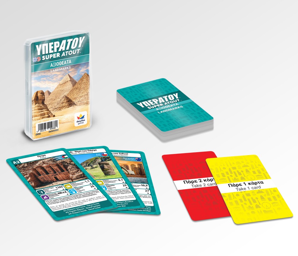 Ετοιμάσου για την απόλυτη μάχη με τα ΥΠΕΡΑΤΟΥ Αξιοθέατα, το αγαπημένο παιχνίδι καρτών μικρών και μεγάλων! Διάλεξε χαρακτηριστικό, σύγκρινε το με του αντιπάλου και κέρδισε την κάρτα! Χρησιμοποίησε έξυπνα την κάρτα ΥΠΕΡΑΤΟΥ και βγες μπροστά! Παίξε και μάθε τα πάντα για τα διάσημα αξιοθέατα!